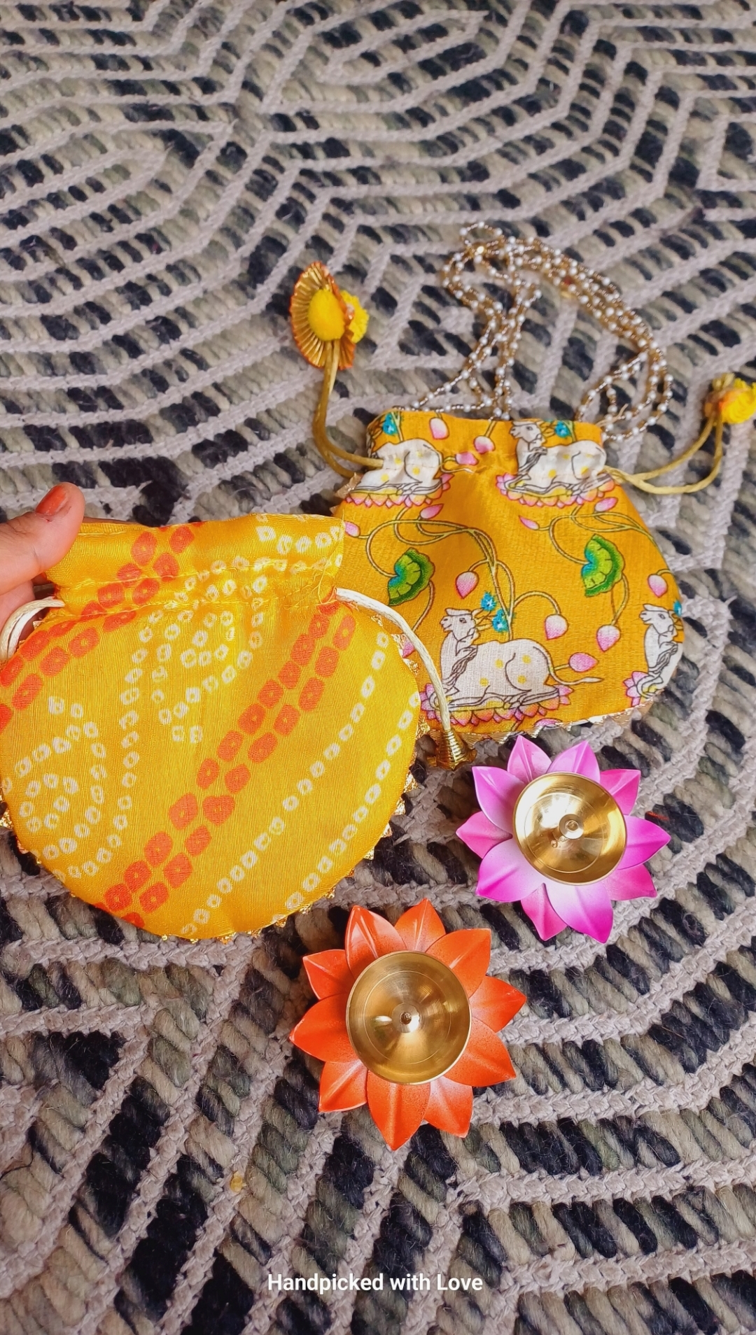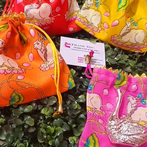 Brass Colored Diyas Size 3 inch Random colors will come Potli size- 5 inch by 7 inch